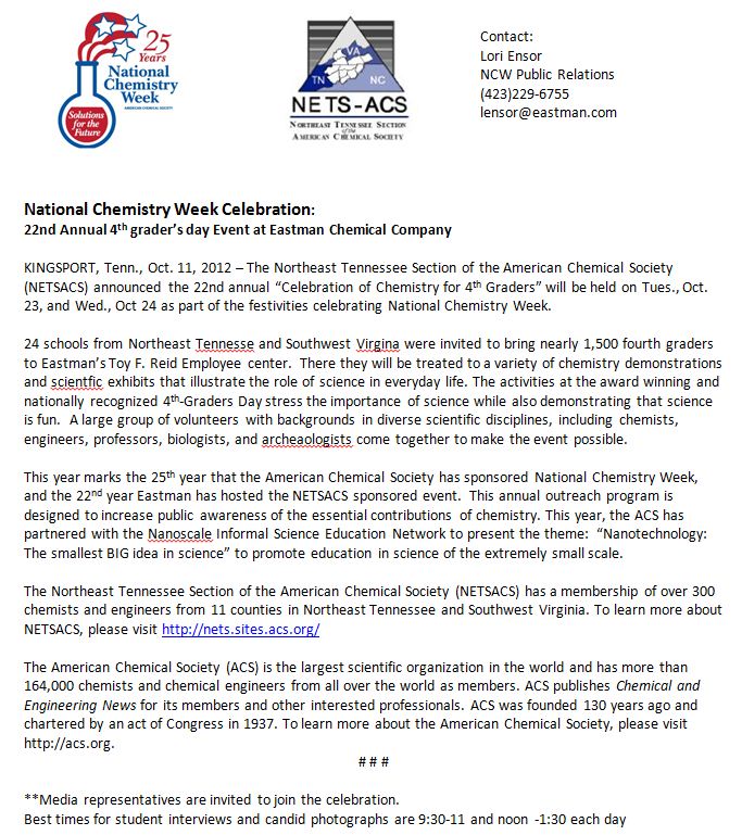 On October 25th and 26th, in conjunction with National Chemistry Week (NCW) and the International Year of Chemistry (IYC), the local American Chemical Society (ACS) section and Eastman Chemical Company will be hosting the 21th annual award-winning celebration. Last two years we had T-shirt design contests and received numerous inspiring drawings from artists as young as 10 years old. The NCW T-shirt committee is now having a contest again to design a new artwork to be printed on the T-shirts that over 1300 4th graders will be wearing at the event!